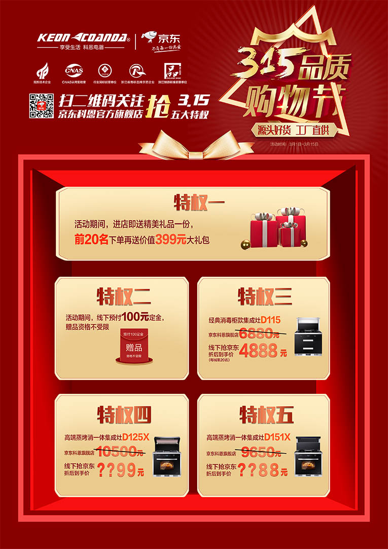集成灶十大品牌、廚電行業(yè)十大品牌科恩電器315品質(zhì)購物節(jié),3月1日至3月15日活動(dòng)期間,關(guān)注京東科恩官方旗艦店搶3.15五大特權(quán)!特權(quán)一:凡進(jìn)店客戶,即送精美禮品一份,前20名下單再送價(jià)值399元大禮包;特權(quán)二:活動(dòng)期間線下預(yù)付100元定金,贈(zèng)品資格將不受限;特權(quán)三:經(jīng)典消毒柜款集成灶D115京東科恩旗艦店6880元,線下?lián)尵〇|折后到手價(jià)4888元;特權(quán)四:高端蒸烤消一體集成灶D125X、D151X線下?lián)尵〇|折后到手價(jià)低到你不能想象!