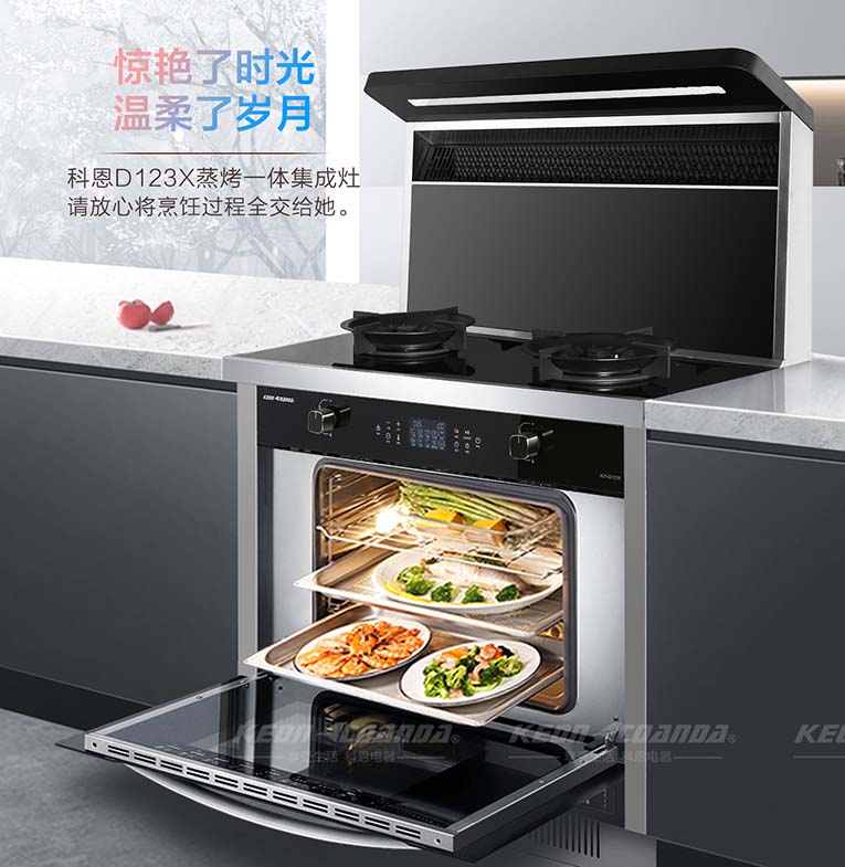 科恩D123X變頻蒸烤消一體智能集成灶為什么頗受消費(fèi)者的喜愛,原因有以下幾方面:1.省空間:科恩D123X集合煙機(jī)、燃?xì)庠睢⒄粝洹⒖鞠洹⑾竟竦榷喾N功能于一體,不僅節(jié)省空間還能省下一米櫥柜空間。2.吸油煙能力強(qiáng):比起傳統(tǒng)煙機(jī),科恩D123X離灶臺(tái)距離更近,吸力更強(qiáng),在油煙產(chǎn)生的第一時(shí)間就可以將其吸走,另外油煙的過濾網(wǎng)采用不沾油特氟龍材料,易清洗、耐高溫、抗腐蝕!3.大火力爆炒:尤其是爆炒菜,D123X鑄鐵鍋架帶雙聚能環(huán)設(shè)計(jì),四通道獨(dú)立引射5.0KW大火力猛火爆炒,寬裕立體上進(jìn)風(fēng)充分燃燒,提高燃燒效率,降低一氧化碳排放。