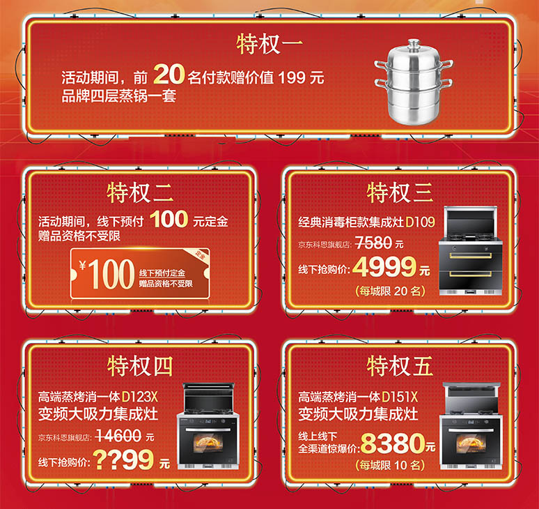 科恩電器一直倡導(dǎo)“樂享智慧烹飪”,本次活動也將以“集成智慧廚房”為宗旨,將活動產(chǎn)品鎖定與高端產(chǎn)品上。據(jù)悉,本次集成灶十大品牌、廚電行業(yè)十大品牌科恩電器攜手京東商城五一狂歡活動,只為讓一直以來支持科恩電器的消費(fèi)者花最少的錢購到心儀的集成灶,五大特權(quán)優(yōu)惠、搶名額、搶補(bǔ)貼,超劃算的活動肯定讓你心動。