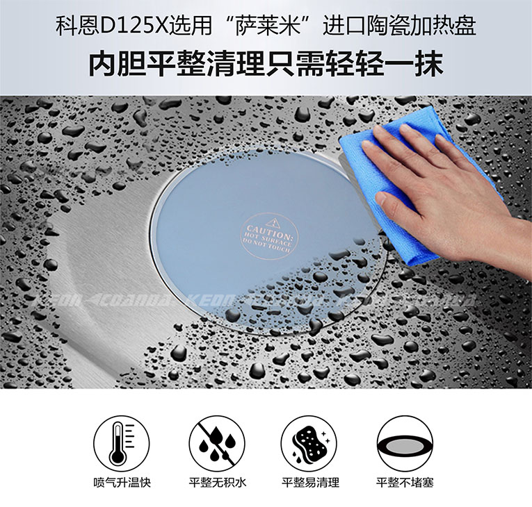 想要蒸出可口美味的菜,蒸箱就需要滿足“溫度高、蒸汽足”的條件,集成灶十大品牌、廚電行業(yè)十大品牌科恩蒸烤消一體集成灶采用噴氣式4D立體蒸技術(shù),噴氣升溫快,360°立體循環(huán)蒸汽環(huán)繞,墻體溫度急速升高,熱風(fēng)由內(nèi)而外,迅速加熱內(nèi)部難熟組織,蒸汽自外向內(nèi),將食物層層包裹,全方位滲透食材,激活新鮮口感,鎖住營(yíng)養(yǎng)與美味,完美解決普通蒸箱蒸制食材太慢、營(yíng)養(yǎng)流失、味道不鮮美等問(wèn)題。另外,底部加熱盤(pán)采用進(jìn)口陶瓷“薩萊米”技術(shù),平整不積水、易清理、不堵塞,只需輕輕一擦就能潔凈。