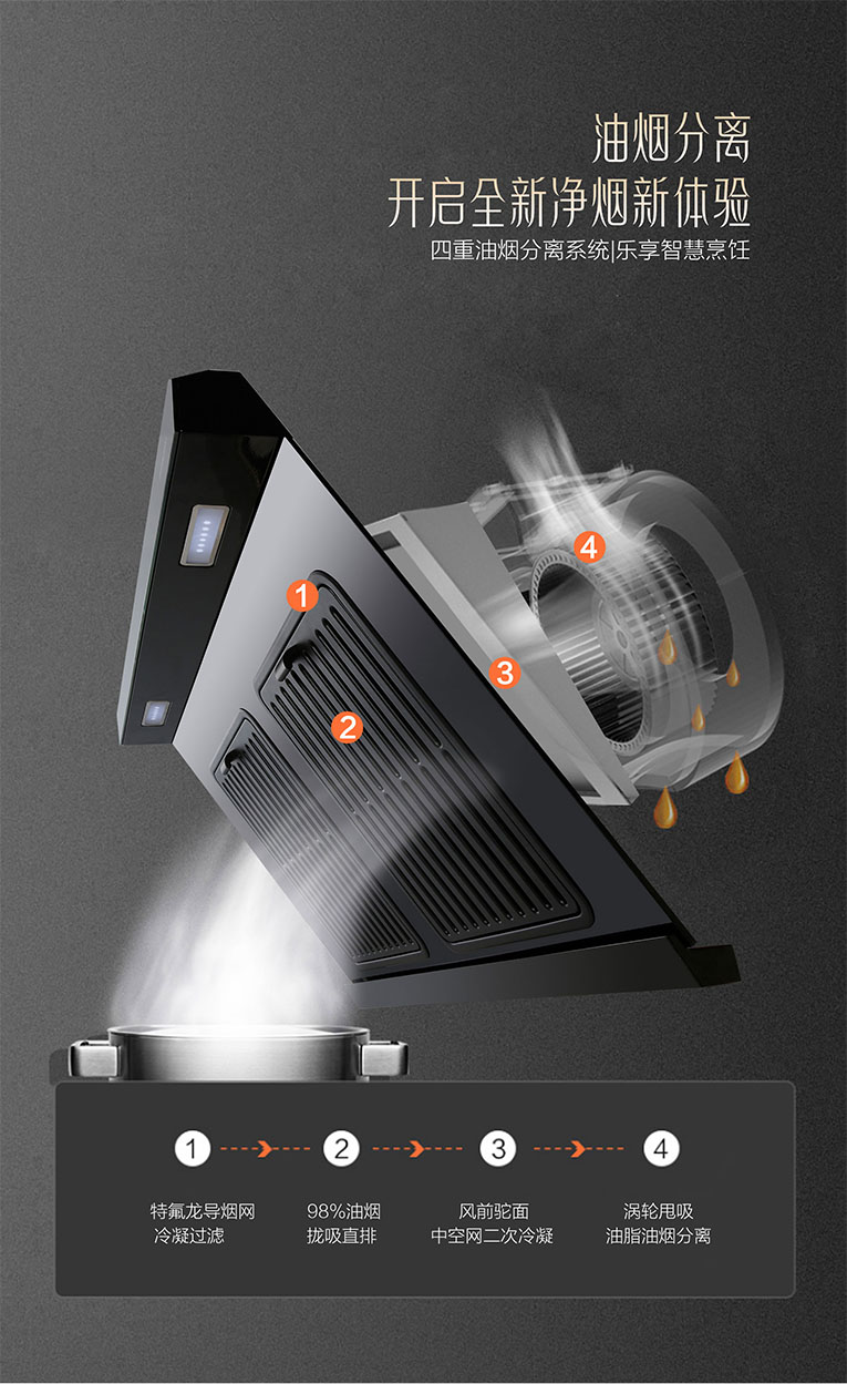 為了達到精準控煙效果,科恩6520大吸力體感觸控煙機擁有900mm攏煙大寬屏,如巨幕般籠罩,快速捕獲升騰油煙,形成有效油煙封鎖帶,迅速攏煙,將油煙“收入囊中”。四重油煙分離系統(tǒng):特氟龍導(dǎo)煙網(wǎng)冷凝過濾→98%油煙攏吸直排→中空網(wǎng)二次冷凝→渦輪甩吸油脂油煙分離。將油煙一網(wǎng)打盡,還原無煙廚房助推凈煙升級,開啟全新凈煙新體驗,卡扣式隔煙屏采用特氟龍工藝技術(shù),不沾油輕松易打理。