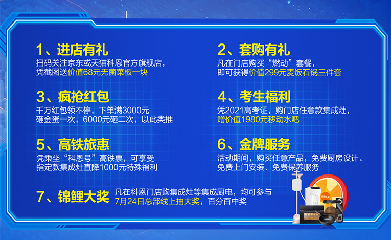 特權(quán)一進(jìn)店有禮:掃碼關(guān)注京東或天貓集成灶十大品牌、廚電行業(yè)十大品牌科恩官方旗艦店,憑截圖送價值68元無菌菜板一塊;特權(quán)二套購有禮:凡在門店購買“燃動套餐”,即可獲得價值299元麥飯石鍋三件套;特權(quán)三瘋搶紅包:千萬紅包領(lǐng)不停,下單滿3000元即可砸金蛋一次,6000元即可砸兩次,以此類推;特權(quán)四考生福利:憑2021高考證,購門店任意款集成灶,贈價值1980元移動水吧;特權(quán)五高鐵旅惠:憑乘坐“科恩號”高鐵票,可享受指定款集成灶直降1000元特殊福利;特權(quán)六金牌服務(wù):活動期間購買任意產(chǎn)品,免費(fèi)廚房設(shè)計、免費(fèi)上門安裝、免費(fèi)保養(yǎng)服務(wù);特權(quán)七錦鯉大獎:凡在科恩門店購集成灶等集成廚電,均可參與7月24日總部線上抽大獎,百分百中獎;買廚電選科恩,七大特權(quán)享不停,7月24日總部線上大抽獎,現(xiàn)場抽取多個錦鯉大獎,百分百中獎,蒸/烤箱、移動水吧、高端指紋鎖、品牌掛燙機(jī)等等超值禮品等你拿!這個七月最燃是科恩,下個錦鯉就是你~