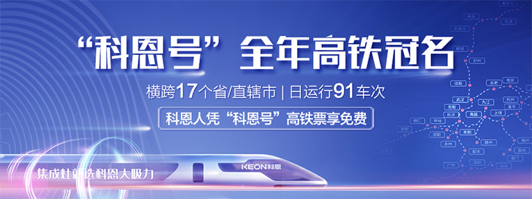 作為集成灶十大品牌、廚電行業(yè)十大品牌的科恩集成灶,杭紹臺(tái)高鐵的建成開(kāi)通,開(kāi)啟了科恩集成灶發(fā)展新篇章。2021年,斥資800萬(wàn),“科恩號(hào)”高鐵品牌專列馳騁大江南北,橫跨17個(gè)省/直轄市,日運(yùn)行91車次。
