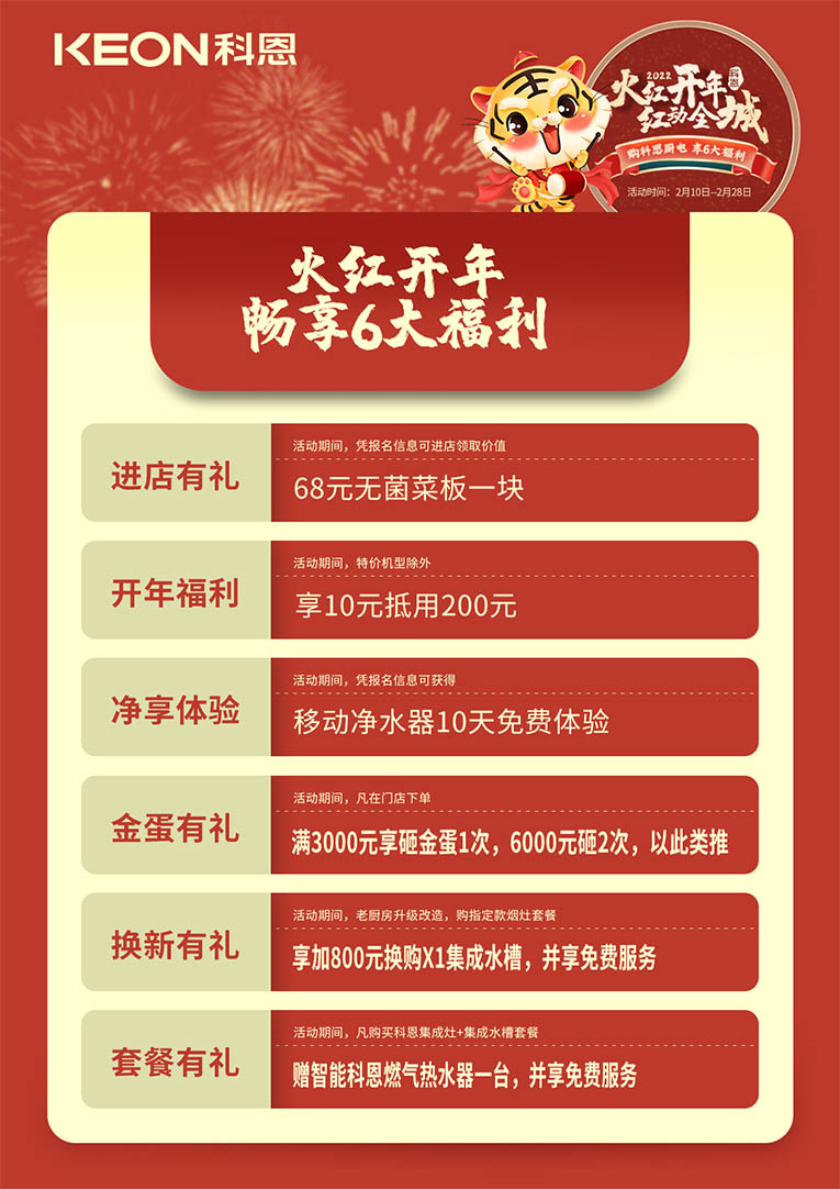 火紅開年,暢享6大福利,2月10日——2月28日前往集成灶十大品牌、廚電行業(yè)十大品牌科恩集成灶全國各大專賣店,就能享受以下特權(quán):進(jìn)店有禮,活動期間憑報名信息可進(jìn)店領(lǐng)取價值68元無菌菜板一塊;開年福利進(jìn)門店享10元抵用200元福利,特價機(jī)型除外;凈享體驗,活動期間憑報名信息可獲得科恩移動凈水器10天免費體驗;金蛋有禮,活動期間凡在門店下單,滿3000元享砸金蛋1次,6000元砸2次,以此類推;換新有禮,活動期間老廚房升級改造,購指定款煙灶套餐,享加800元換購X1集成水槽,并享免費服務(wù);套餐有禮,活動期間凡購買科恩集成灶+集成水槽套餐,贈智能科恩燃?xì)鉄崴饕慌_,并享免費服務(wù)。