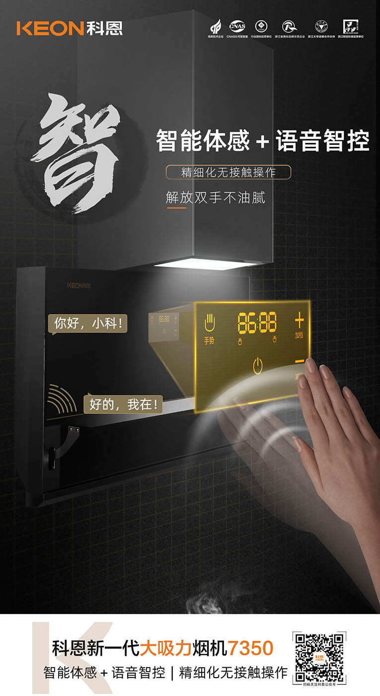 集成灶十大品牌、廚電行業(yè)十大品牌科恩新一代大吸力煙機(jī)7350還擁有智能語(yǔ)音控制與體感操控,呼喚“你好小科”可控制煙機(jī)。