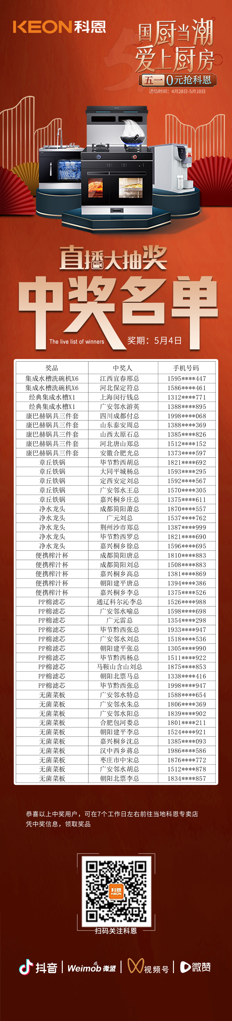 國廚當潮,愛上廚房——0元搶科恩活動正在火爆進行中,為回饋消費者,科恩電器特于5月4日晚舉行了直播大抽獎活動。