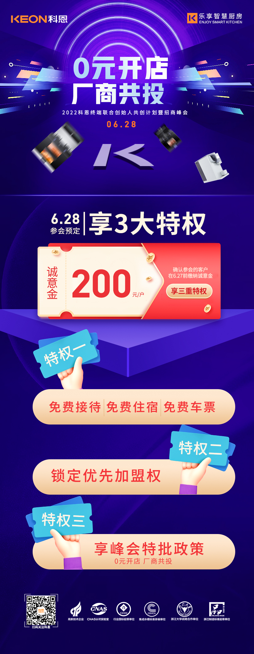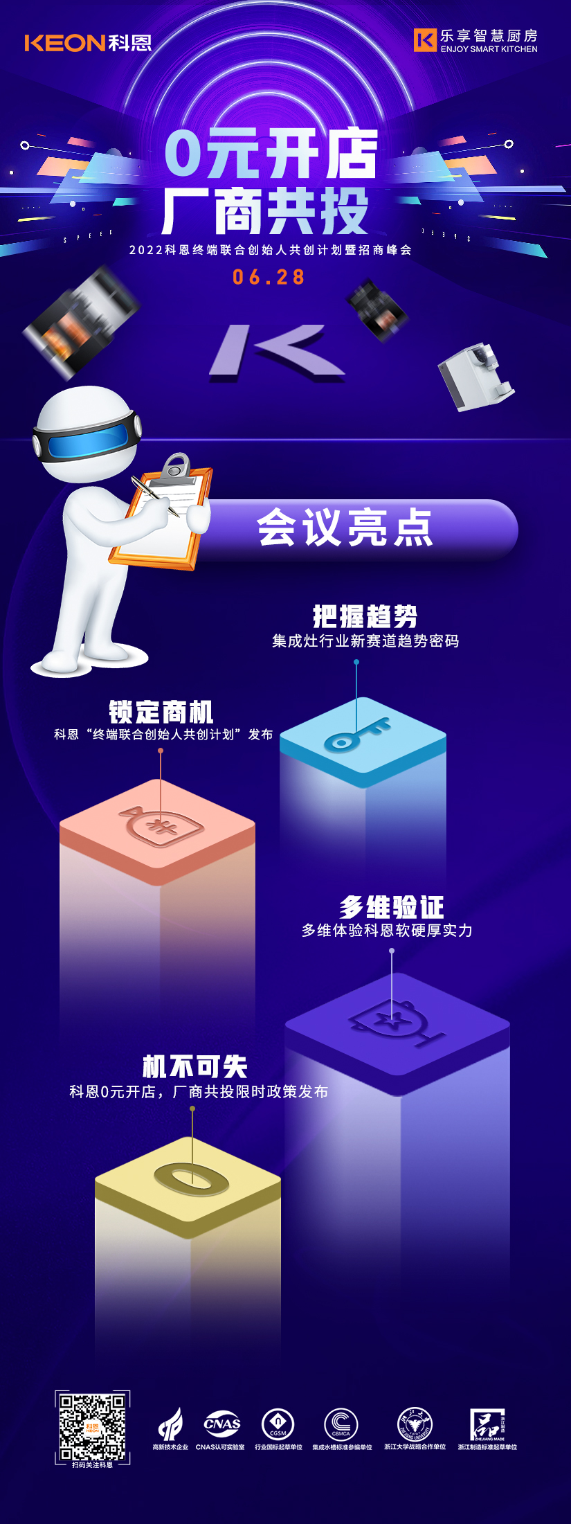 6月28日2022科恩終端聯(lián)合創(chuàng)始人共創(chuàng)計劃暨招商峰會將在廚具之都嵊州隆重舉辦,本次峰會將以“0元開店,廠商共投”為主題,邀請來自全國各地的行業(yè)精英、投資大佬匯聚一堂,共同探討廚電行業(yè)發(fā)展趨勢,解鎖集成灶行業(yè)新賽道趨勢密碼,多維驗證科恩集團(tuán)軟硬厚實力,屆時,將為各位來賓解讀限時政策內(nèi)容,為各位投資人提供一個潛力無限,共創(chuàng)霸業(yè)的優(yōu)秀共創(chuàng)平臺。