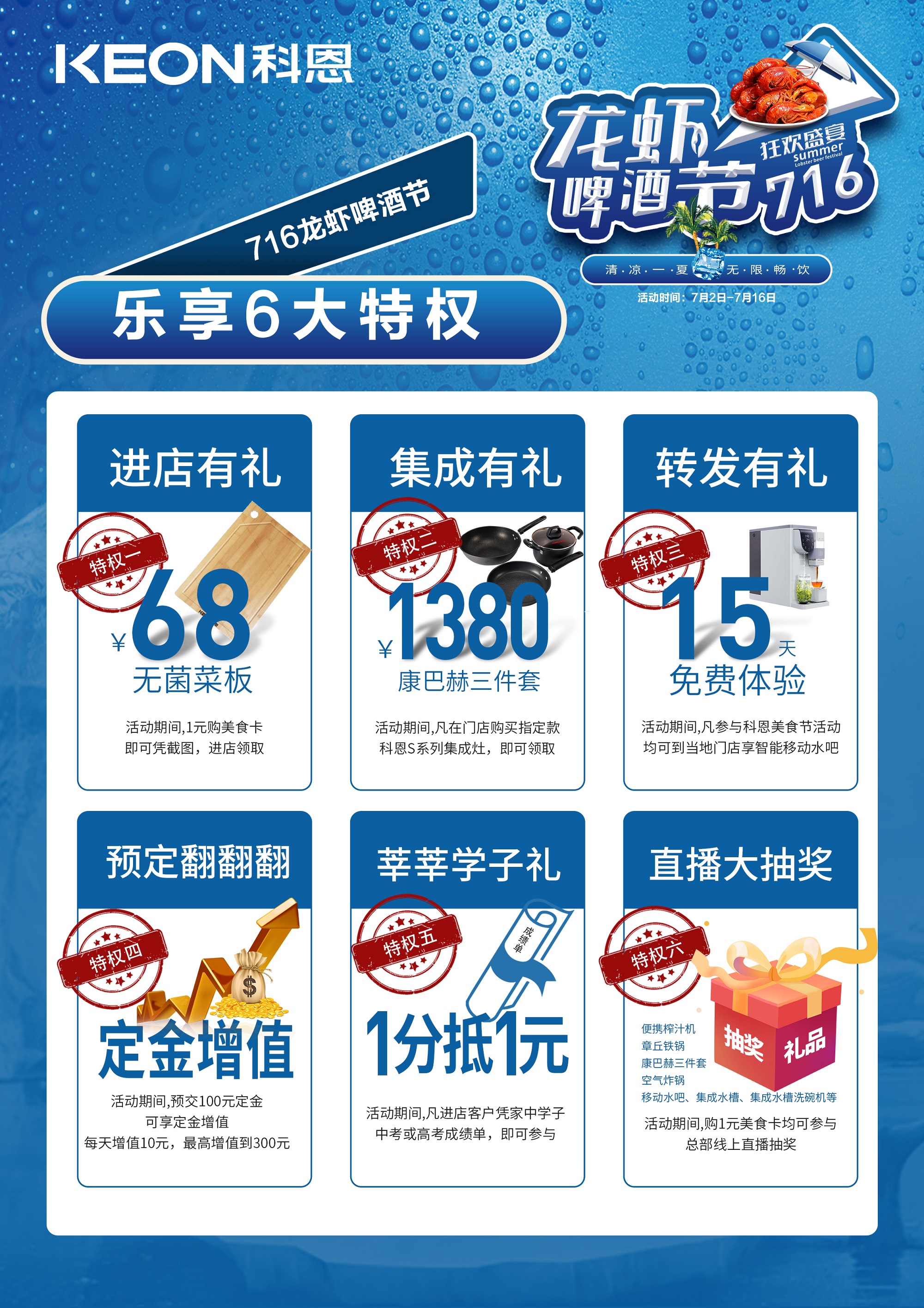7月2日-7月16日 ——“清涼一夏,無限暢飲”,科恩集成灶「龍蝦啤酒節」熱辣來襲 ,約“惠”科恩,嗨“啤”一夏,美食不停,福利不斷,放肆嗨吃嗨購嗨玩,千城千店,縱享六大特權福利!不僅有啤酒、美食輪番上陣,更有看直播,中大獎、贏好禮等多重福利,科恩寵你,不講道理!清爽的啤酒,麥香醇厚,泡沫柔軟細膩,約上三五好友,齊聚科恩門店,談天說地,激情暢飲,喝著啤酒,嗦著龍蝦,瀟灑人生,自在樂逍遙!