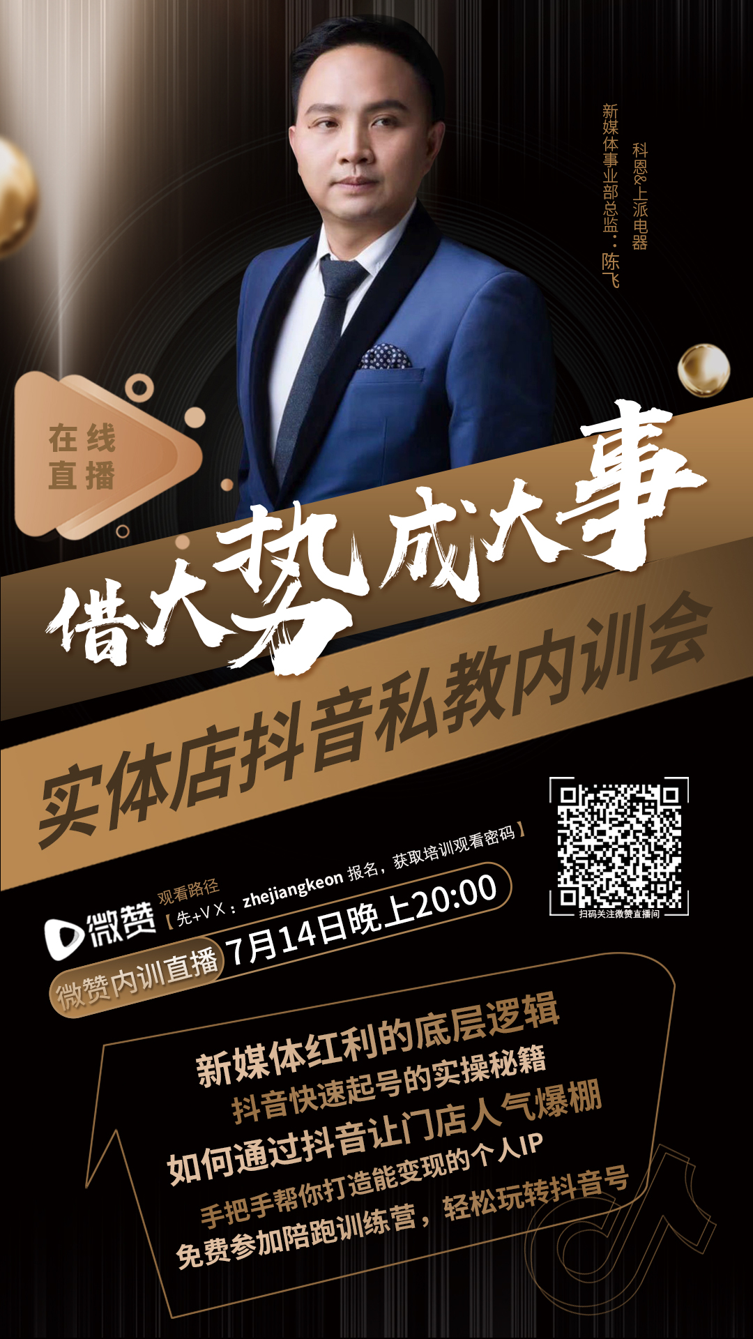 培訓(xùn)時(shí)間:7月14日晚上8點(diǎn),適合人群:實(shí)體店老板,你將得到:新媒體紅利的底層邏輯、抖音快速起號(hào)的實(shí)操秘籍、如何通過抖音讓門店人氣爆棚、手把手幫你打造能變現(xiàn)的個(gè)人IP、免費(fèi)參加陪跑訓(xùn)練營(yíng),輕松玩轉(zhuǎn)抖音號(hào)!分享人: 抖音流量運(yùn)營(yíng)特級(jí)講師、科恩&上派新媒體事業(yè)部總監(jiān),觀看路徑:微信號(hào)zhejiangkeon報(bào)名,獲得免費(fèi)內(nèi)訓(xùn)資格!