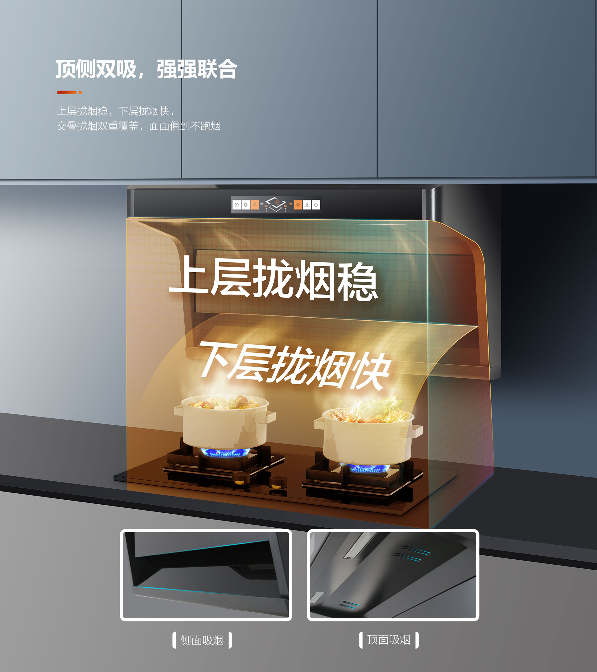 “上攏吸+下近吸”雙重凈煙設(shè)計(jì),搭載20m3/min颶風(fēng)吸力,有效防止油煙逃匿,上下全面網(wǎng)羅油煙,高速直排,全方位圍剿油煙,高效凈煙不撲臉!