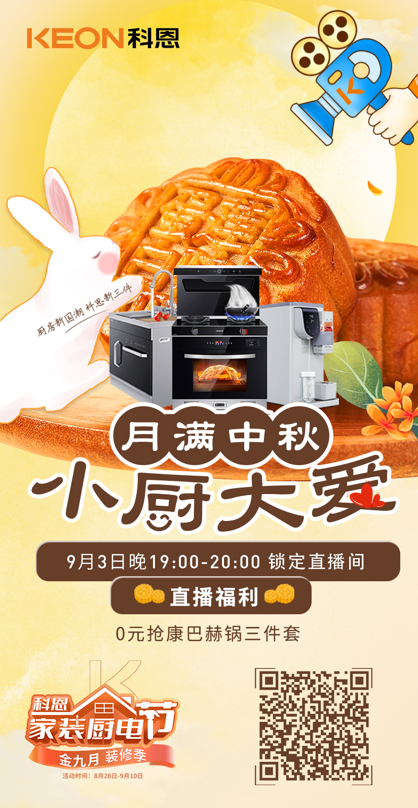 金九月·裝修季——科恩家裝廚電節(jié)【月滿中秋 | 小廚大愛】第二期月餅DIY直播將于9月3日晚7點(diǎn)準(zhǔn)時(shí)開播,鎖定科恩直播間,提前購1元廚電美食卡獲抽獎(jiǎng)資格一起來看直播做美食中大獎(jiǎng)吧!