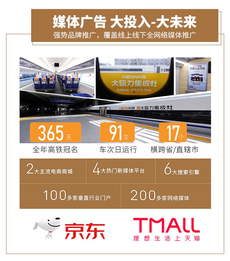 科恩集成灶自2021年以來全力加速品牌推廣進(jìn)程,大手筆投放高鐵廣告,斥巨資全年冠名——“科恩號”高鐵品牌專列:橫跨17個省/直轄市,日運行91車次,傳播面積之廣,受及群眾之多,在消費者心目中有著極強(qiáng)的影響力和公信力,借助高鐵“國家名片”屬性為品牌權(quán)威背書,讓“集成灶就選科恩大吸力”口號傳遍大江南北!如今,科恩電器再次重磅出擊,攜手嵊新高鐵站,強(qiáng)勢霸屏其黃金廣告C位,精準(zhǔn)覆蓋,持續(xù)品牌形象建設(shè),為品牌傳播助力加碼,實力詮釋“科恩速度”!