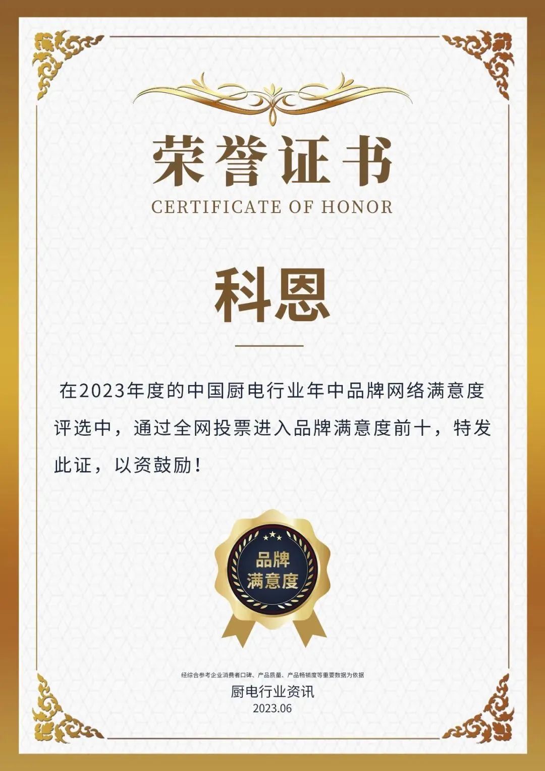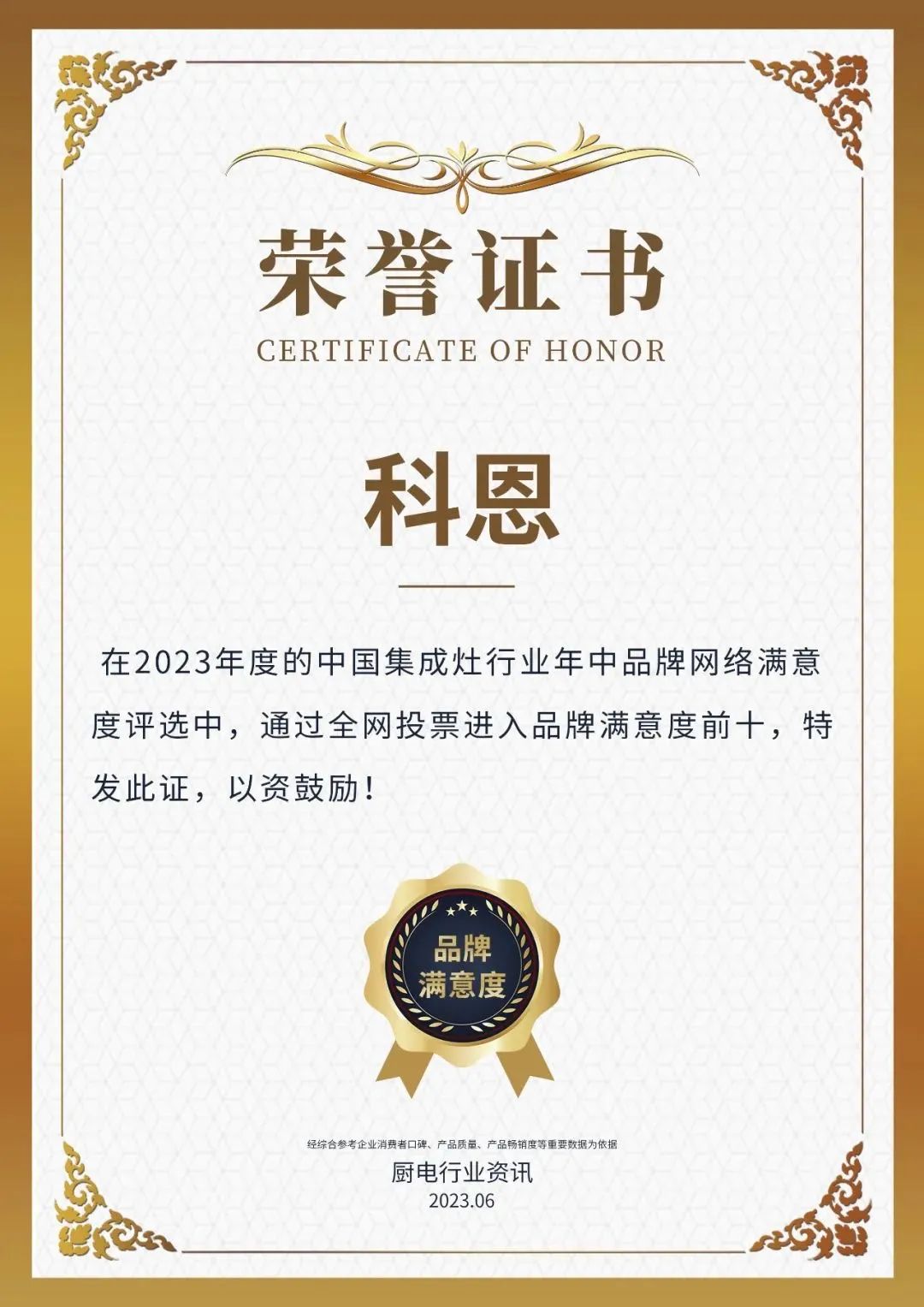 616日,浙江科恩電器有限公司再度榮獲“2023年度中國廚電行業品牌年中網絡滿意度前十“2023年度中國集成灶行業品牌年中網絡滿意度前十