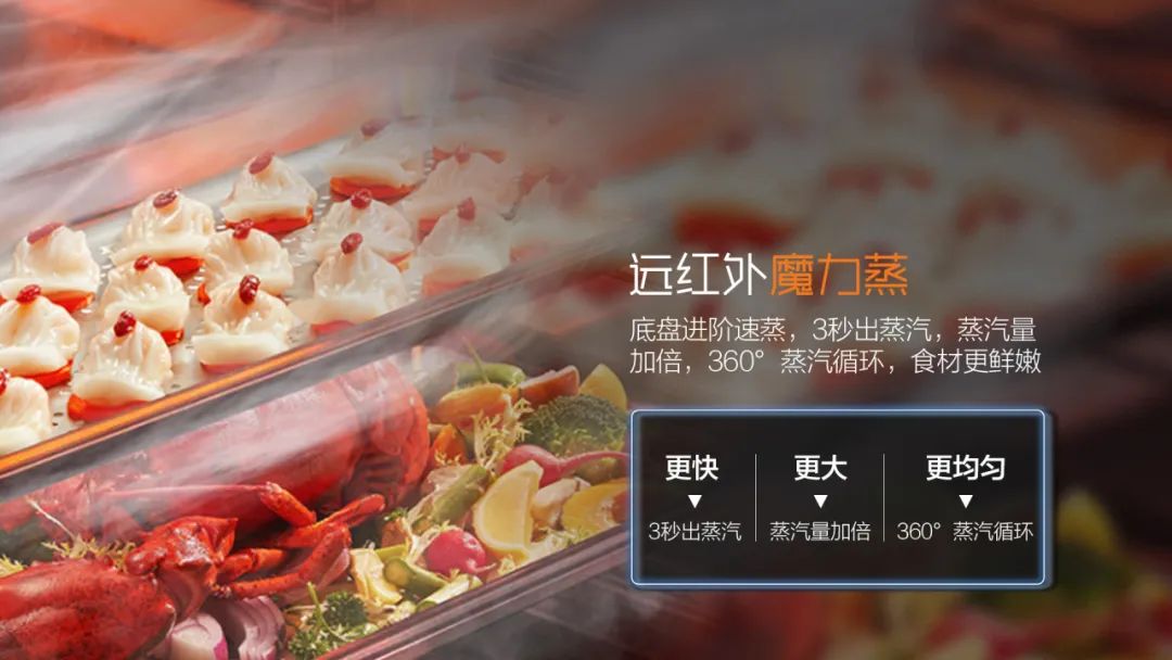 燒烤油炸固然美味,偶爾也需要來點(diǎn)養(yǎng)生蒸菜!A3系列采用底盤進(jìn)階速蒸,3秒出蒸汽,蒸汽量加倍,360°蒸汽循環(huán),蒸的更美味!