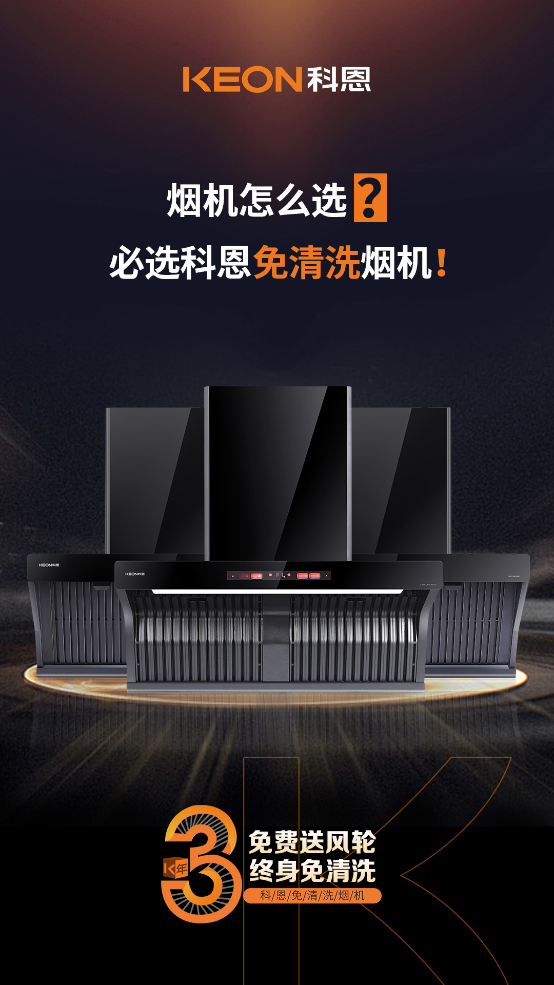 科恩電器行業率先提出3年免費送風輪服務,徹底解決殘余油脂油污問題,真正實現煙機終身免清洗!