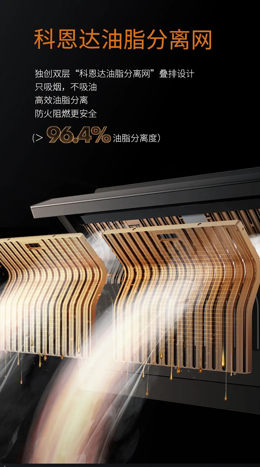 6K省心超體驗二:科學(xué)設(shè)計免清洗,耐用省心!科恩達(dá)油脂分離網(wǎng)完美實現(xiàn)煙機(jī)免清洗。科恩達(dá)油脂分離網(wǎng)可實現(xiàn)高效油脂分離,油脂分離率>96%,實現(xiàn)油脂不進(jìn)門,煙機(jī)免清洗的理想狀態(tài)。
