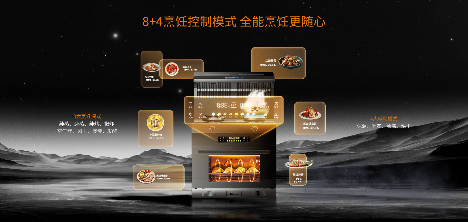 科恩G500防爆免清洗集成灶8+4烹飪控制模式,全能烹飪隨心掌握。純蒸、速蒸、純烤、嫩炸、空氣炸、風干、煲燉、發酵,8種烹飪模式涵蓋中西烹飪各種需求。尤其針對愛養生的小仙女,純蒸與煲燉功能更是不可缺少。