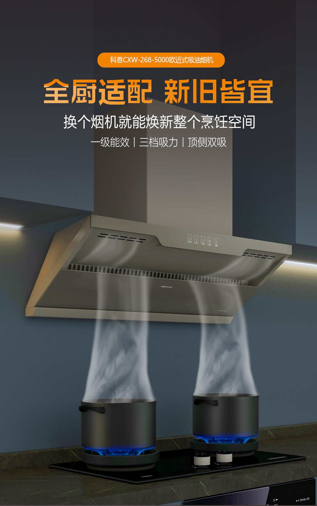 嵌入美學,颶風凈界??贫鳉W近式吸油煙機5000,275mm纖薄機身平行嵌入櫥柜。太空灰如暮色浸染,適配任意風格,敞開式攏煙區擴大50%,科恩爆炒時颶風瞬吸,辣味未散油煙已凈。舊廚房的逆襲法則,獨立安裝不挑戶型,嵌入即高級。IP67級LED冷光燈穿透蒸汽迷霧;兩檔吸力+爆炒模式;3分鐘延時凈煙,余味消散無蹤;老破小廚房秒變開放式料理廳。