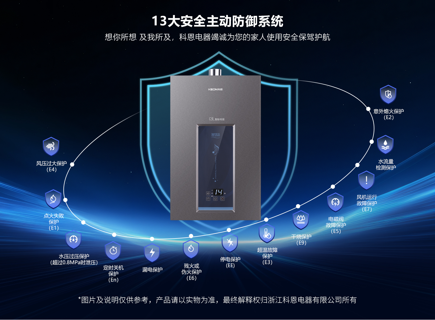 靜音節(jié)能,綠色安心。智能分段燃燒技術,讓沐浴始終宜人,風機低速運行超靜音,享受寧靜的沐浴體驗,熱效率高達89%以上,節(jié)能更環(huán)保,老房高層也能暢享穩(wěn)定熱水。十三重護,安全無憂。13重全天候安全保障,守護全家溫暖,過熱、過壓、熄火保護三重防護,意外停電或煙道堵塞時自動斷氣,定時關機保護,蜂鳴提⽰及報警功能,全面杜絕安全隱患,專注享受沐浴無后顧之憂。