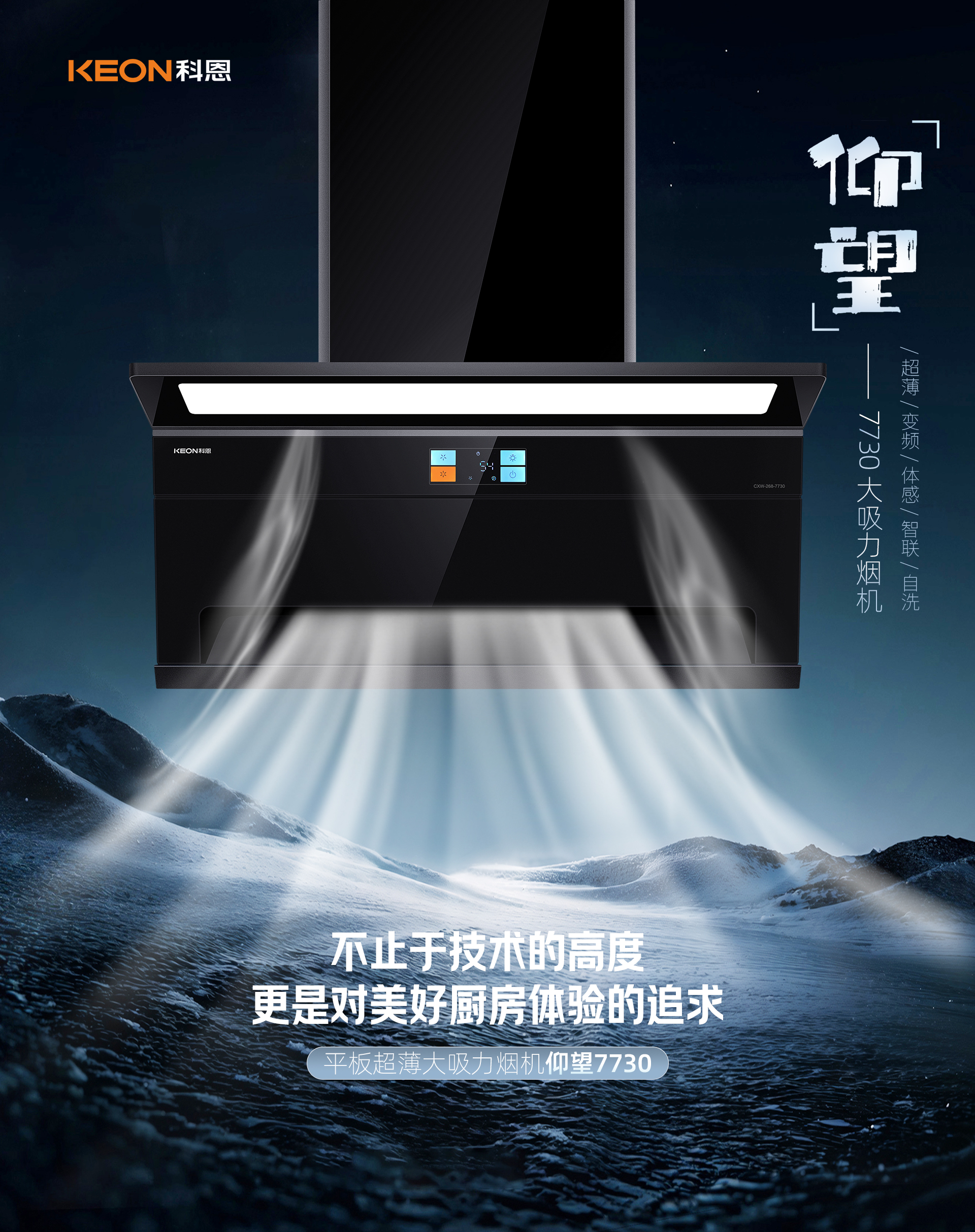 輕薄美學,空間煥新傳統煙機笨重,廚房逼仄壓抑科恩7730黑騎士,打破空間桎梏120°天鵝頸上仰設計,2.0cm超薄視覺0.5立方敞開空間,翻炒轉身不碰頭特氟龍一體成型,不沾油污更顯質感鉆石切割背板,硬朗線條點亮廚房智控凈吸,告別油膩爆炒油煙升騰快,傳統煙機難捕捉24m³澎湃吸力,高位頂吸加側吸負壓區內傾滑翔設計,凈煙更快更徹底揮手智控開關機,調節風量不沾油模塊化彩屏觸控,操作方便簡單1000Pa強風壓,高峰排煙不倒灌聯動便捷,清潔無憂烹飪分心忘開煙機,油煙彌漫難收拾7730+KN810L煙灶聯動,點火煙機自動啟磁吸科恩達網板,一拉一提易清潔電熱自清洗,甩掉油污保吸力3分鐘延時關機,余煙散盡更健康IP67全景天幕燈,護眼清晰烹佳肴
