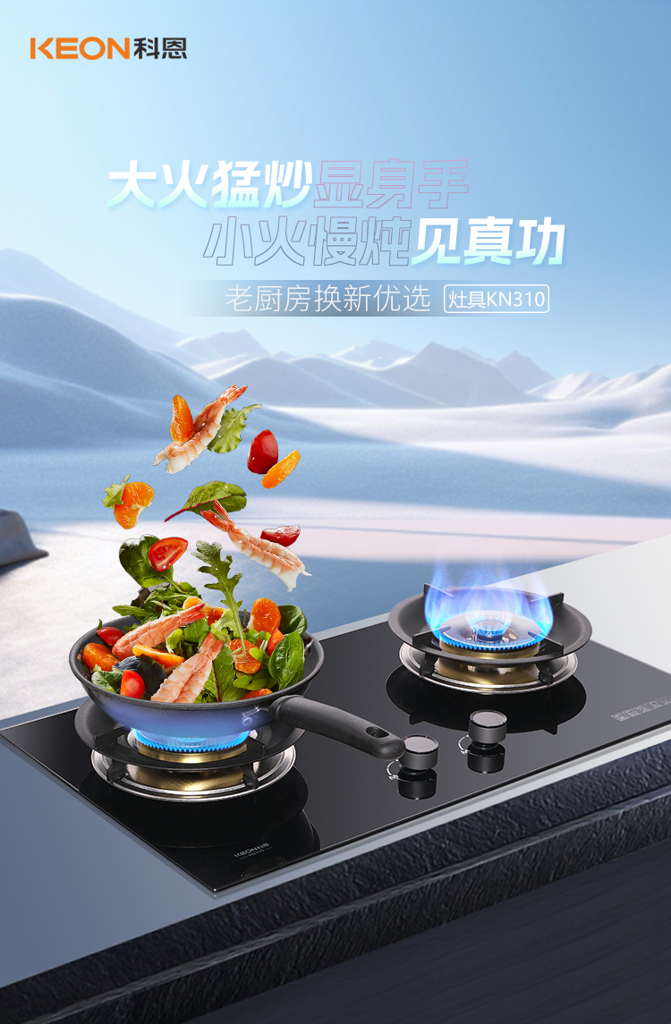 新國標落地,能效門檻再提升。老舊灶具費氣低效,爆炒力不從心,科恩KN310新一級能效灶具重磅登場。以全能實力適配多樣廚房,讓烹飪重拾酣暢與安心。