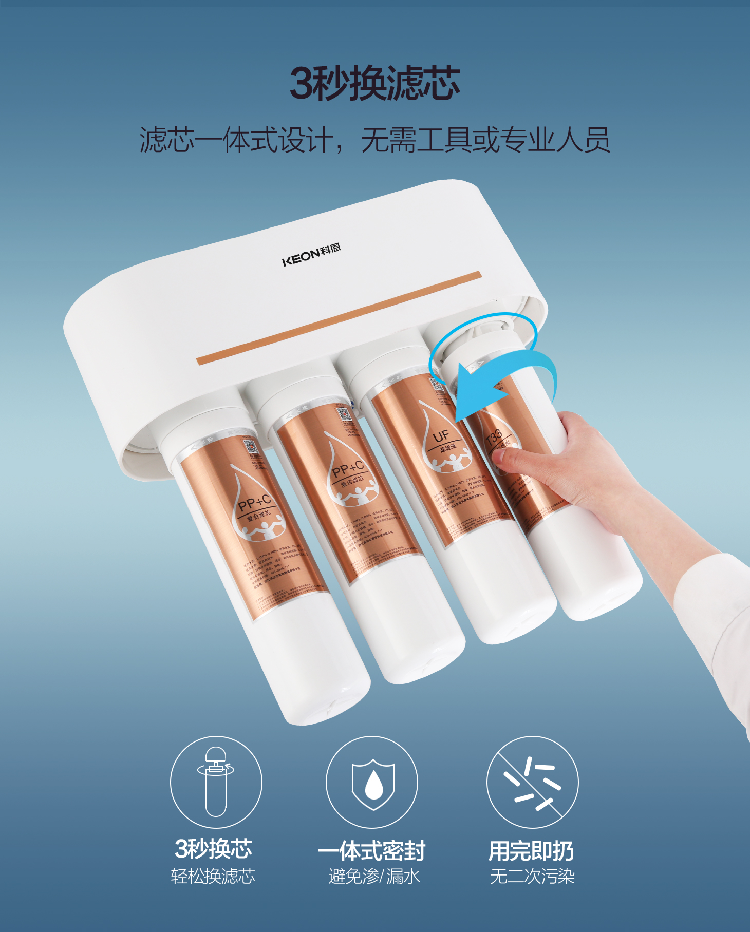 - 卡接式一體式濾芯,3秒換芯,方便快捷。