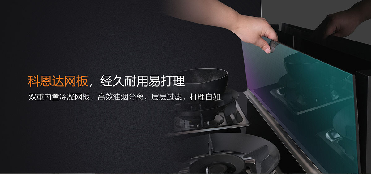 雙重冷凝網板,高效油煙分離,打理方便自如