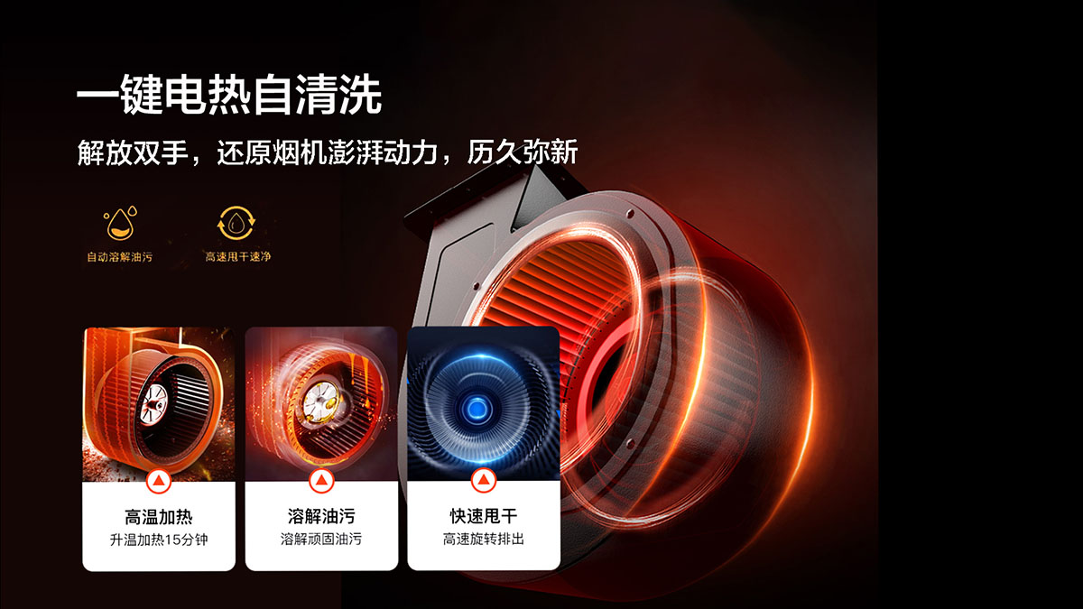 一鍵電熱自清洗,解放雙手,還原煙機澎湃動力,歷久彌新