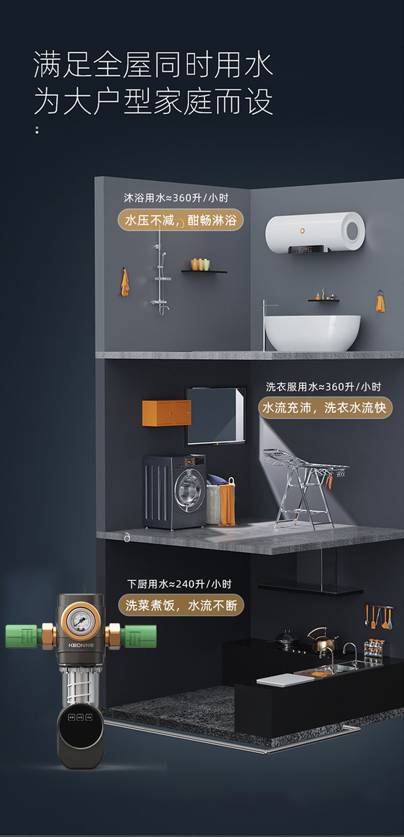 • 6噸/小時大流量,快速過濾,用水無壓力