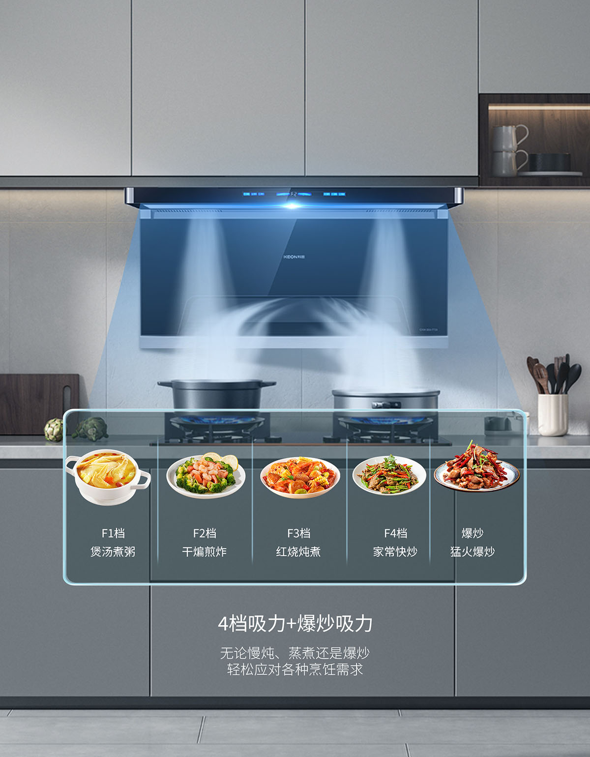 一鍵23.5m³/min爆炒大吸力,無懼重油爆炒