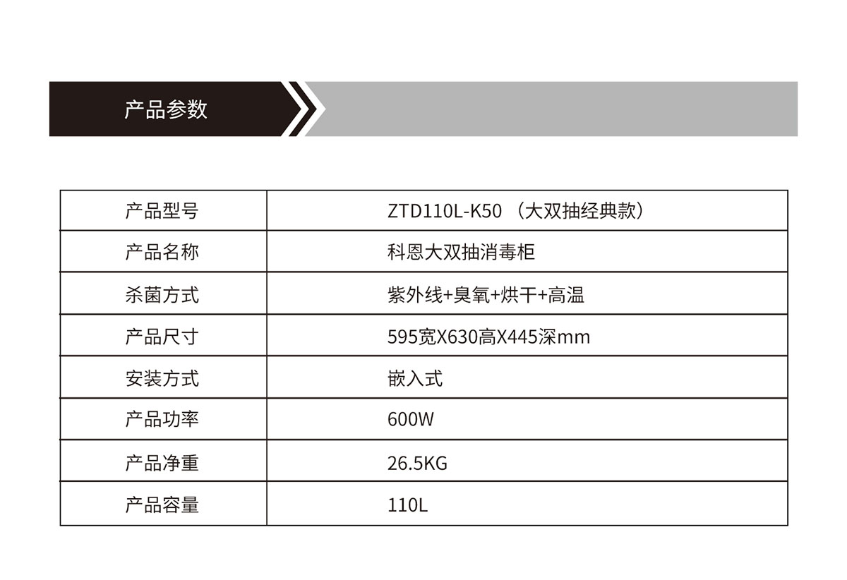 產(chǎn)品型號:ZTD110L-K50 (大雙抽經(jīng)典款)產(chǎn)品名稱:科恩大雙抽消毒柜