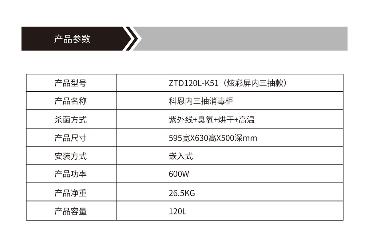 產(chǎn)品型號:ZTD120L-K51(炫彩屏內(nèi)三抽款)產(chǎn)品名稱:科恩內(nèi)三抽消毒柜