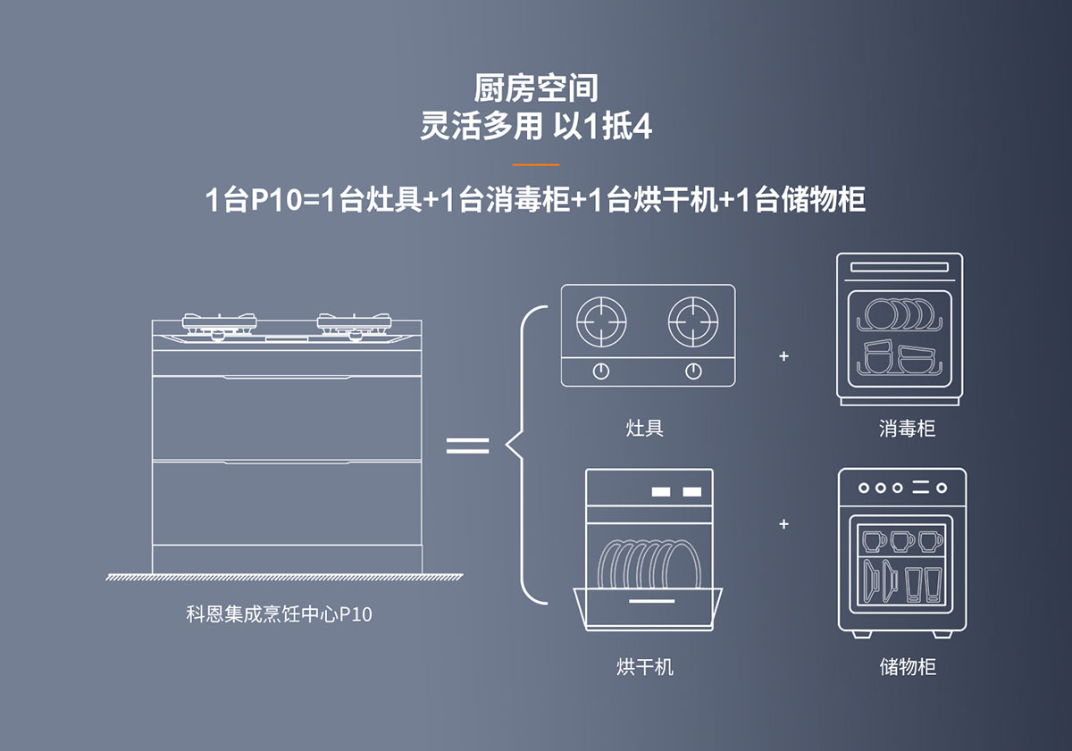 - 以1抵4,1臺P10=1臺灶具+1臺消毒柜+1臺烘干機(jī)+1臺儲物柜
