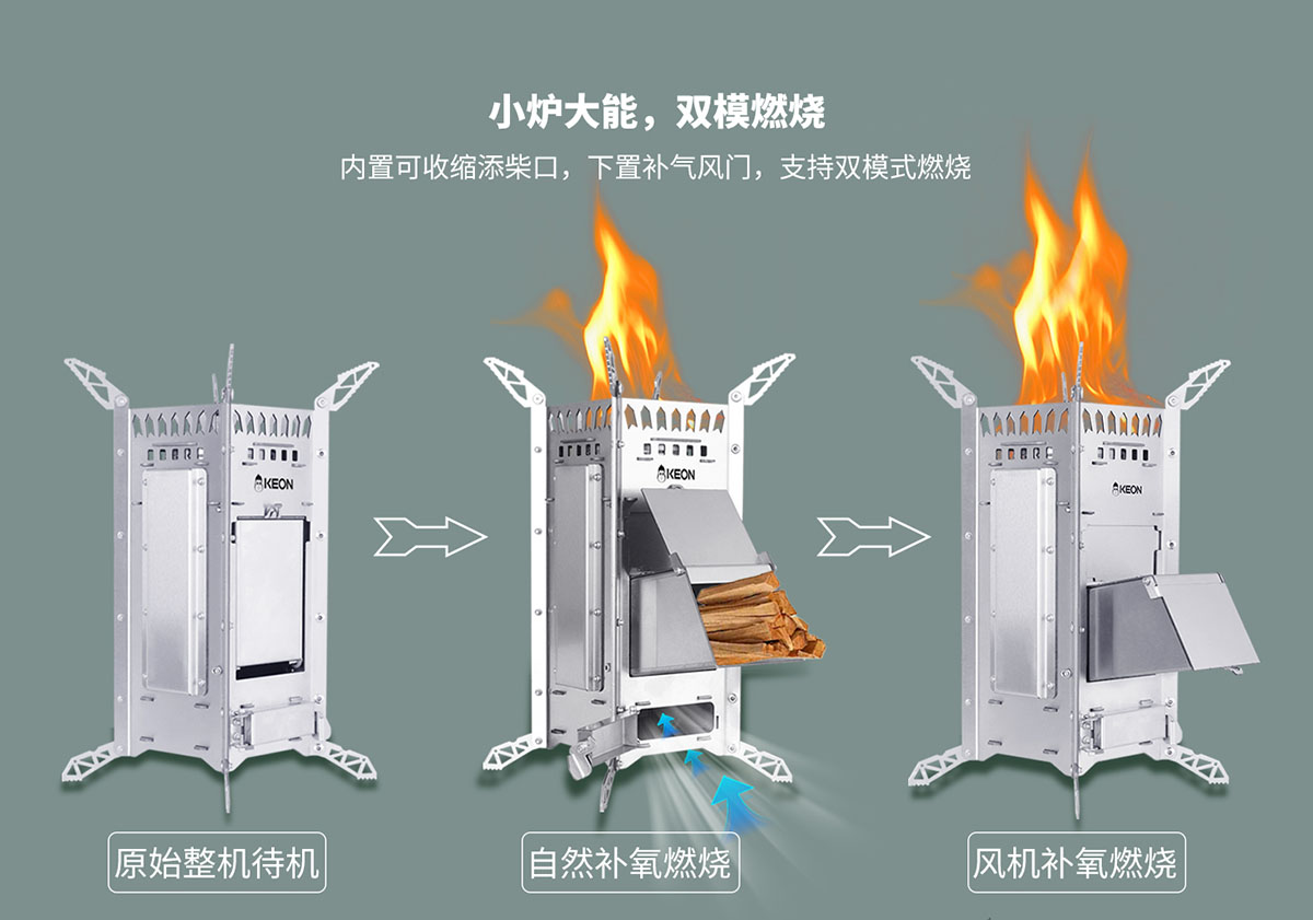 內(nèi)置可收縮添柴口,下置補氣風門,支持雙模式燃燒